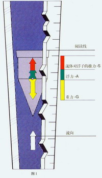 流量計測量原理 金屬轉子流量計是一種變面積式流量計,它通常具有一段直立的錐管和一只可以在其中自由的隨流量大小上下移動的浮子(如圖1)。當流體自下而上流經錐管時,流體的動能在浮子上產生的推力S和流體的浮力A使浮子上升。隨著錐管內壁與浮子之間的環形流通面積增大,流體動能在浮子上產生的推力S隨之下降。當推力S與浮力之和等于浮子自身重力G時,浮子處于平衡,并穩定在某一高度上,該高度位置對應的刻度指示流過流量計的流量。 |