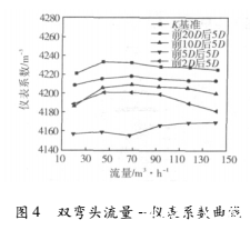 圖4為雙彎頭流量-儀表系數曲線。